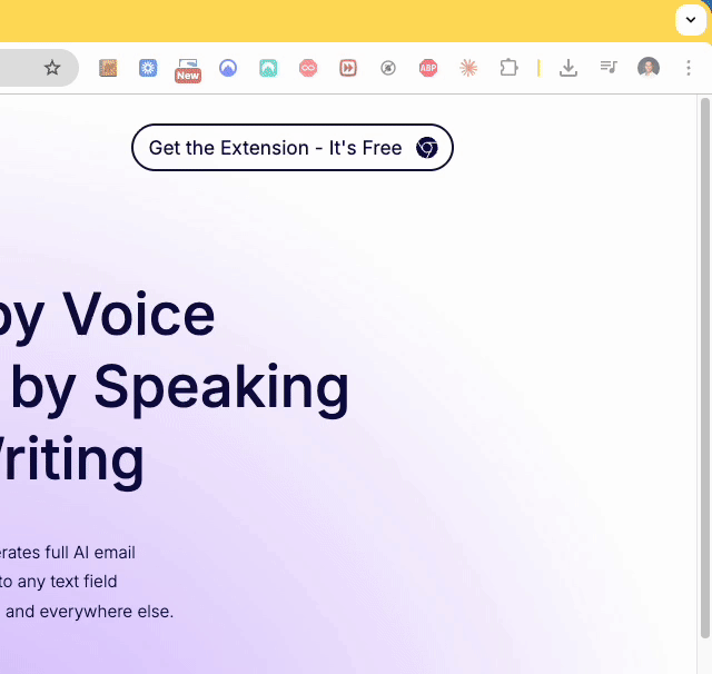To use WriteByVoice on any website, pin it to your Chrome toolbar:1. Click the puzzle piece icon (🧩) in the top-right corner of Chrome